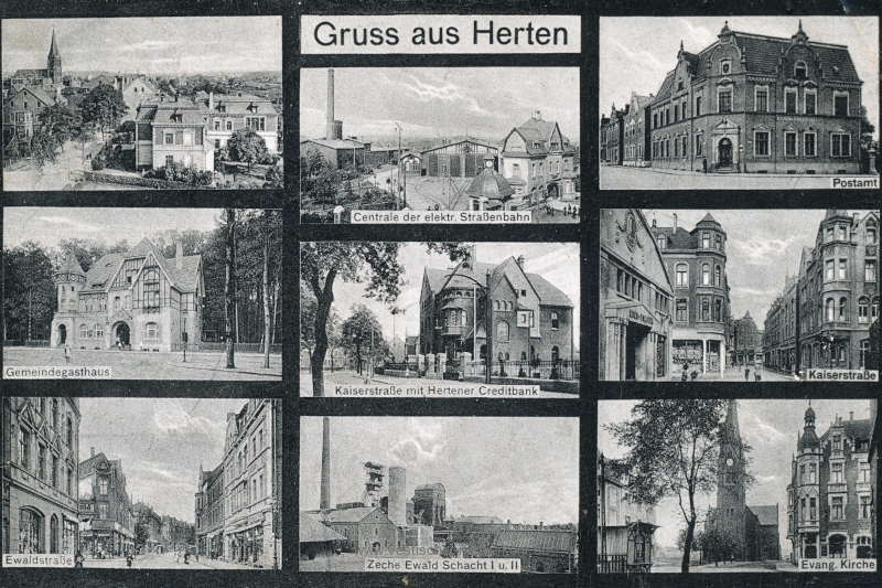 In der Stadt war man stolz auf den Sitz der Vestischen Kleinbahnen. Das erklärt, warum der ortsansässige Postkartenverleger Theodor Volmar ein Bild des Betriebshofes in das Zentrum einer im Jahr 1917 produzierten Postkarte rückte. In der – grobkörnigen – Ausschnittvergrößerung ist die damalige Anordnung der Hallengleise gut zu erkennen. Um der Werkstatt mehr Raum für Wartungsarbeiten zur Verfügung zu stellen, wurde das Tor zum zweiten Gleis verschlossen (Sammlung Ludwig Schönefeld).