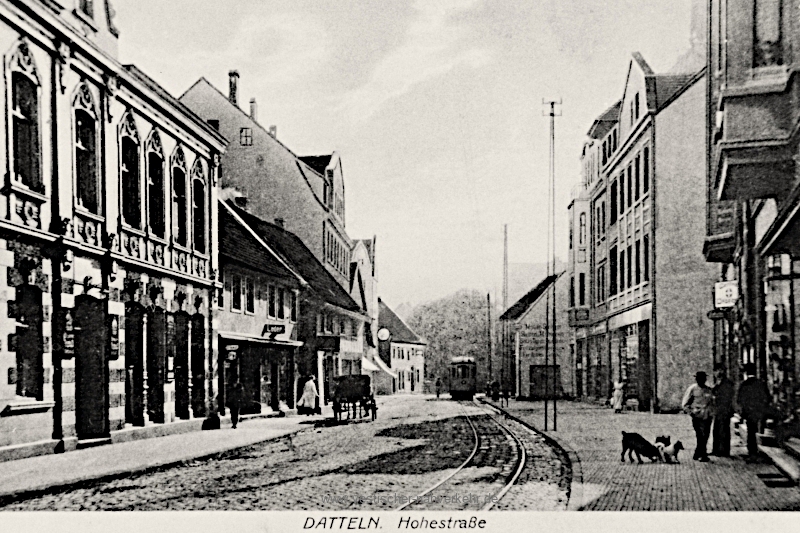 Das Beitragsbild zeigt einen Straßenbahnwagen in Höhe der Häuser Hohe Straße 9 und 7 in der Anfangszeit der Strecke (Sammlung Stadtarchiv Datteln). Das nachfolgende Motiv dokumentiert die Endstelle in der Lohstraße. Es wurde zwischen September 1915 und 1921 aufgenommen. Damals fuhren hier die Linien 2 (Recklinghausen – Erkenschwick – Datteln) und 3 (Recklinghausen – Suderwich – Datteln). Im Hintergrund ist der im Zweiten Weltkrieg zerstörte, aus dem Jahr 1250 stammende historische Turm der St.-Amandus-Kirche zu erkennen (Sammlung Stadtarchiv Datteln).