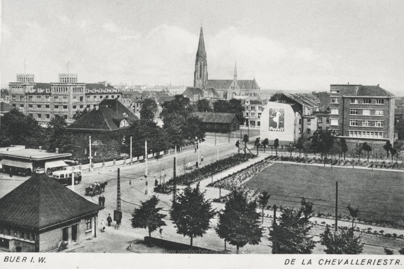 In ihrer Ausgabe vom 30. Juni 1922 berichtete die Buersche Zeitung über die geplante Erweiterung der Essener Straße zwischen der Kreuzung mit der Bredde- und Hochstraße sowie der Kreuzung mit der De-La-Chevallerie-Straße zu einem innerstädtischen Platz. Ebenso wird die Herstellung einer Gleisverbindung zwischen den Gleisen der Vestischen Straßenbahnen und denen der Bochum-Gelsenkirchener Straßenbahnen AG angekündigt. Dafür wurden insgesamt 1,115 Millionen Mark im Haushalt der Stadt Buer bereitgestellt.