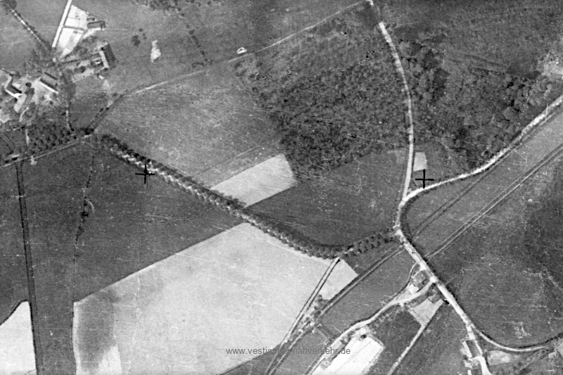 Die ehemalige Straßentrasse im Süden der Autobahn A 2 ist inzwischen mit einem Industriegebiet überbaut. Auf dem nachfolgenden Luftbild aus dem Jahr 1951 ist unter der die Straßenführung vor dem Autobahnbau noch unter der Bodenkrume eines Ackers zu erkennen. Auch die Suderwicher Straße ist gut zu erkennen (© RVR – 1951-1980 – dl-de/by-2-0).